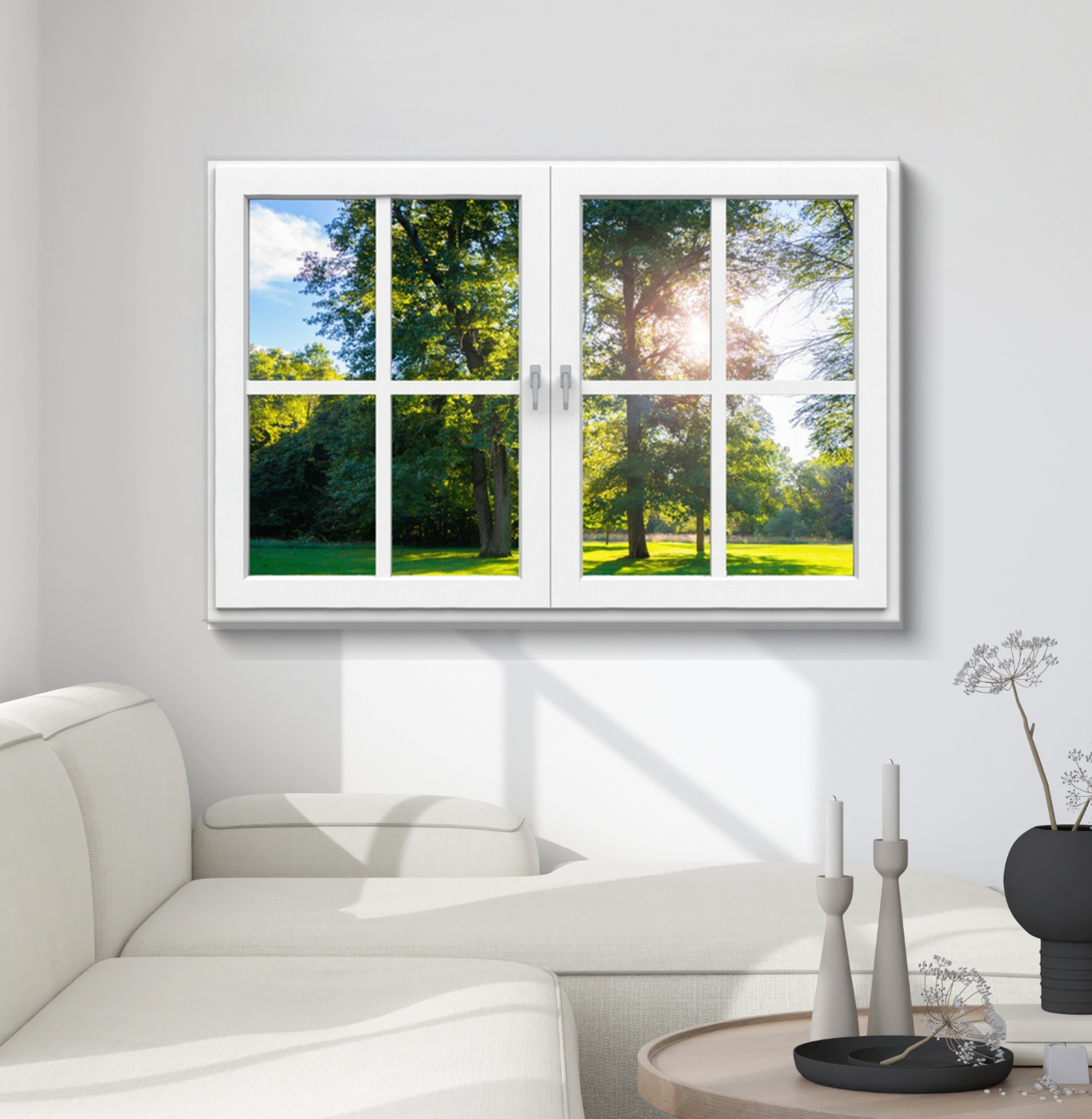 Canvas Wrap - View of Window Frame With Sun Shining Through Lush Trees in a Meadow