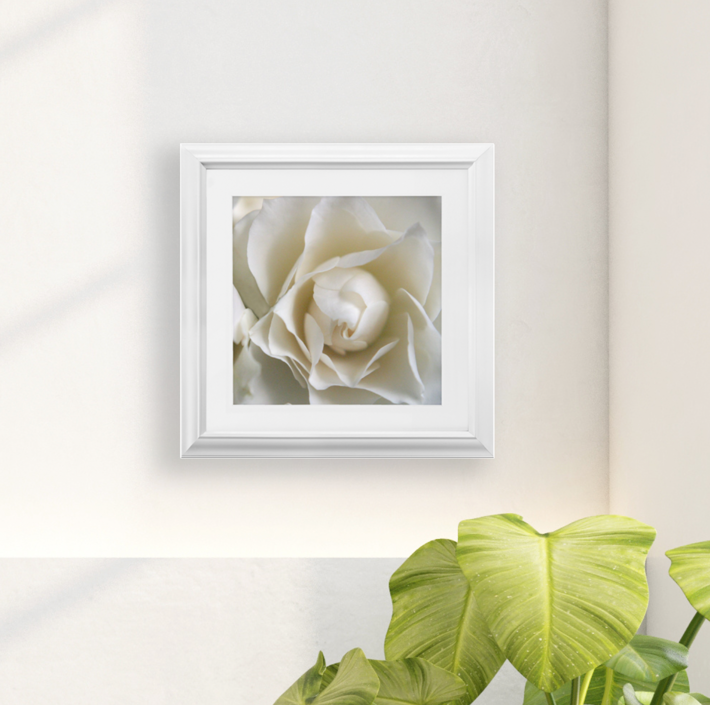 16x16 Framed Art Print - White Rose - Ready to Hang Art. This print is one of many flora images in my portfolio. All my images are thoughtfully curated to present the best framed art for your walls. The print is framed in a stylish 16x16 frame and mat. The print is protected by a scratch-resistant acrylic insert. Comes ready to hang. Wipe clean with a damp cloth.