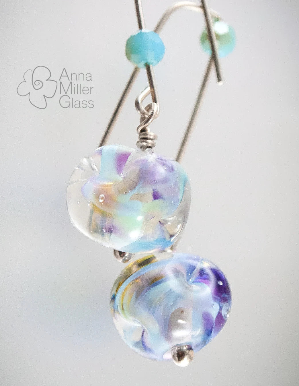 Dip into the serene charm of my lampwork glass beads - Waterworld. Enjoy the dance of watercolor shades around clear freeform glass beads, each sparkling delicately in the light. The beads, about 0.4 inches in diameter, strike the perfect balance - large enough to make a statement, yet comfortable for all-day wear.