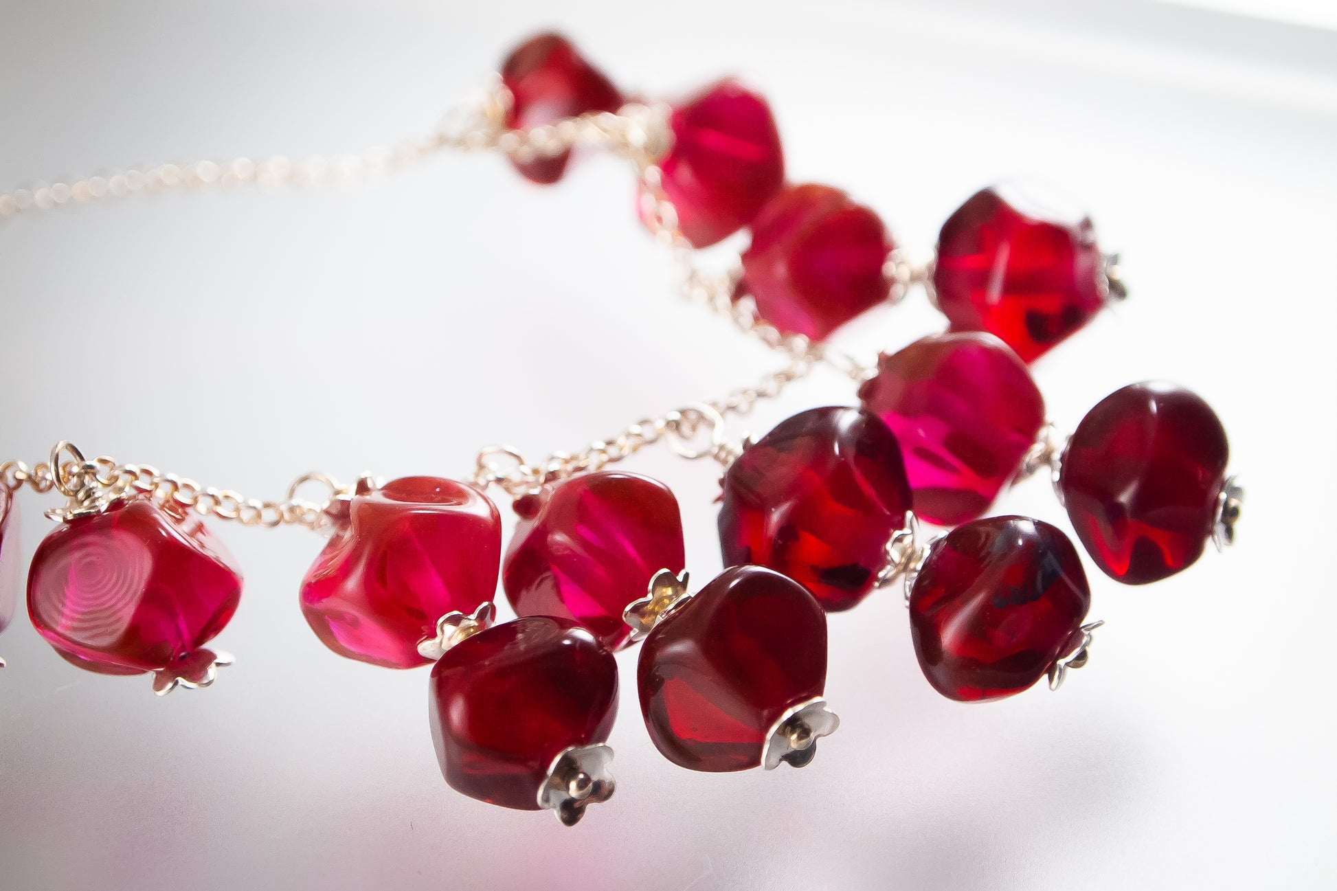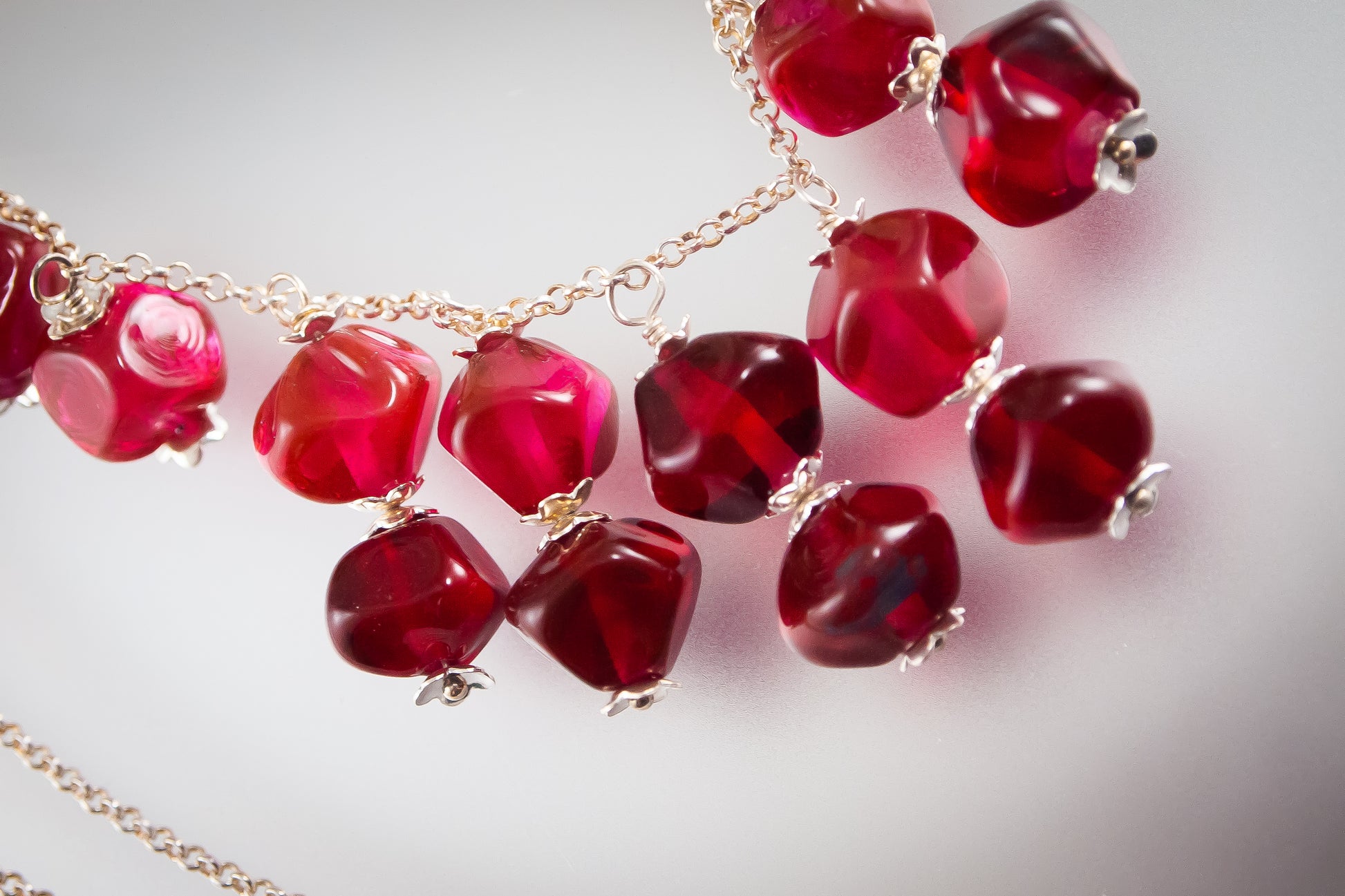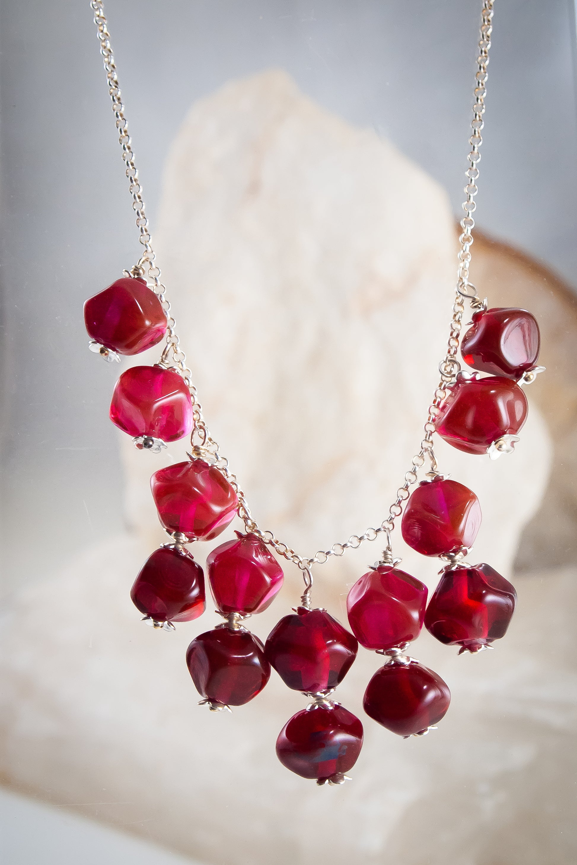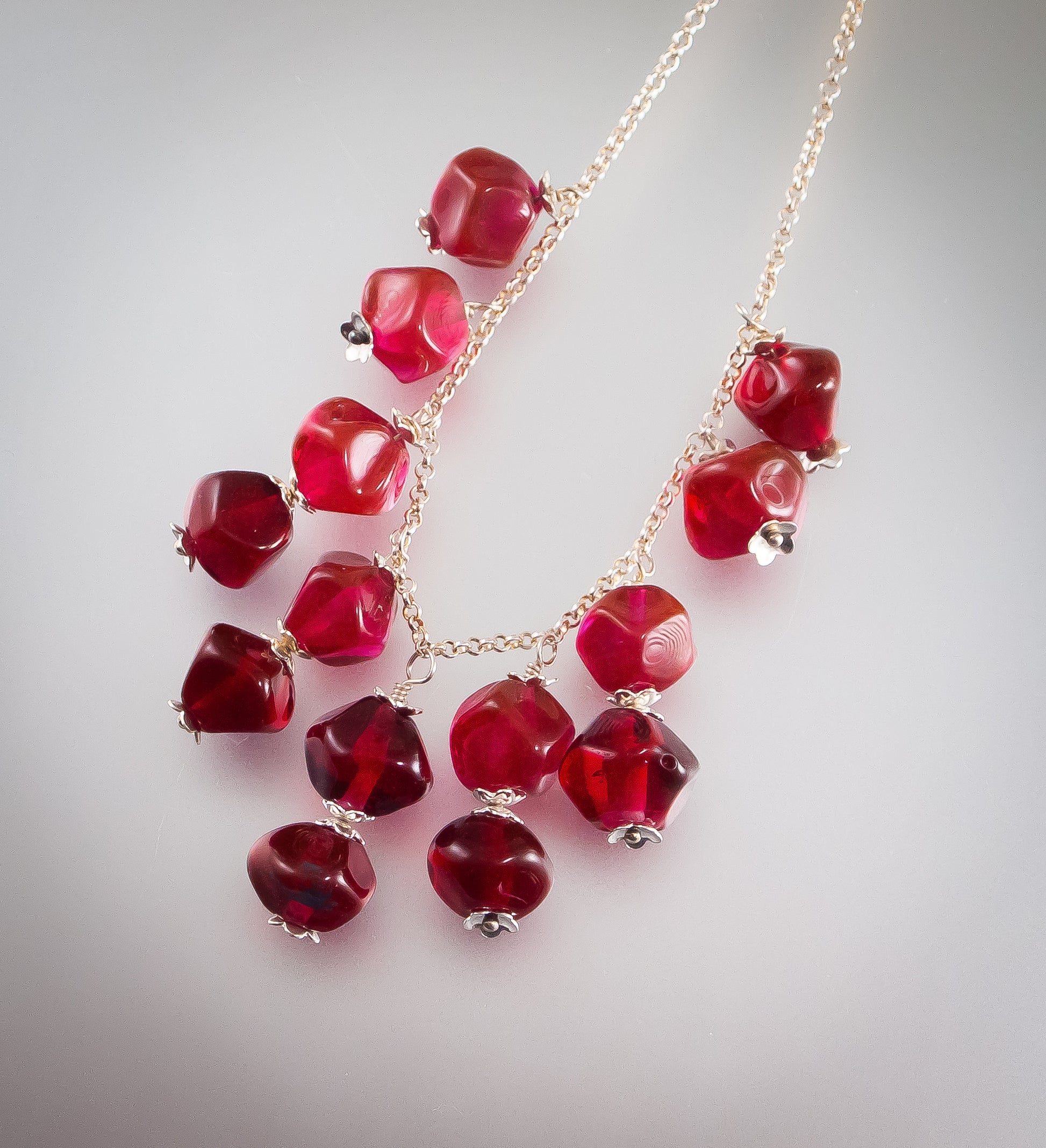 The focal point of this necklace is the ruby red transparent glass, shaped into organic pomegranate seeds. These unique beads are then fitted onto a rolo sterling silver chain. The intrinsic beauty of the pomegranate motif adds a touch of nature-inspired charm.