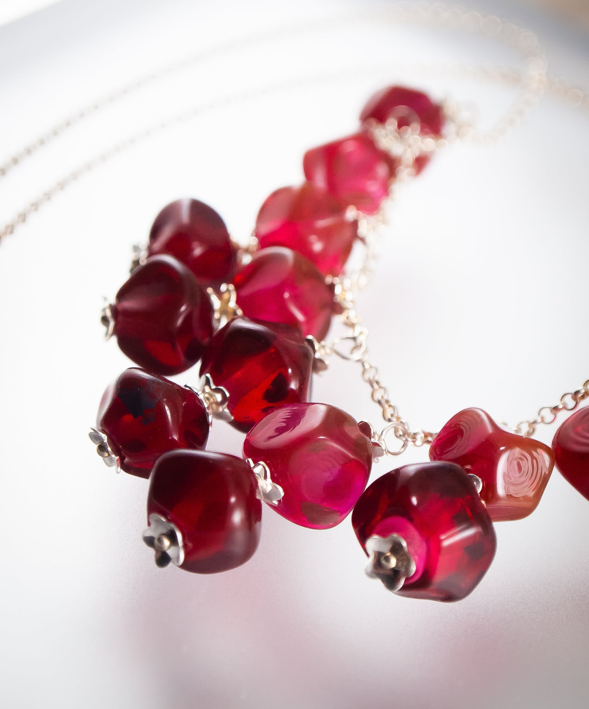 Adorn yourself with this Pomegranate red glass necklace, and let the timeless beauty and individuality of handcrafted glass jewelry make a statement that is uniquely yours.
